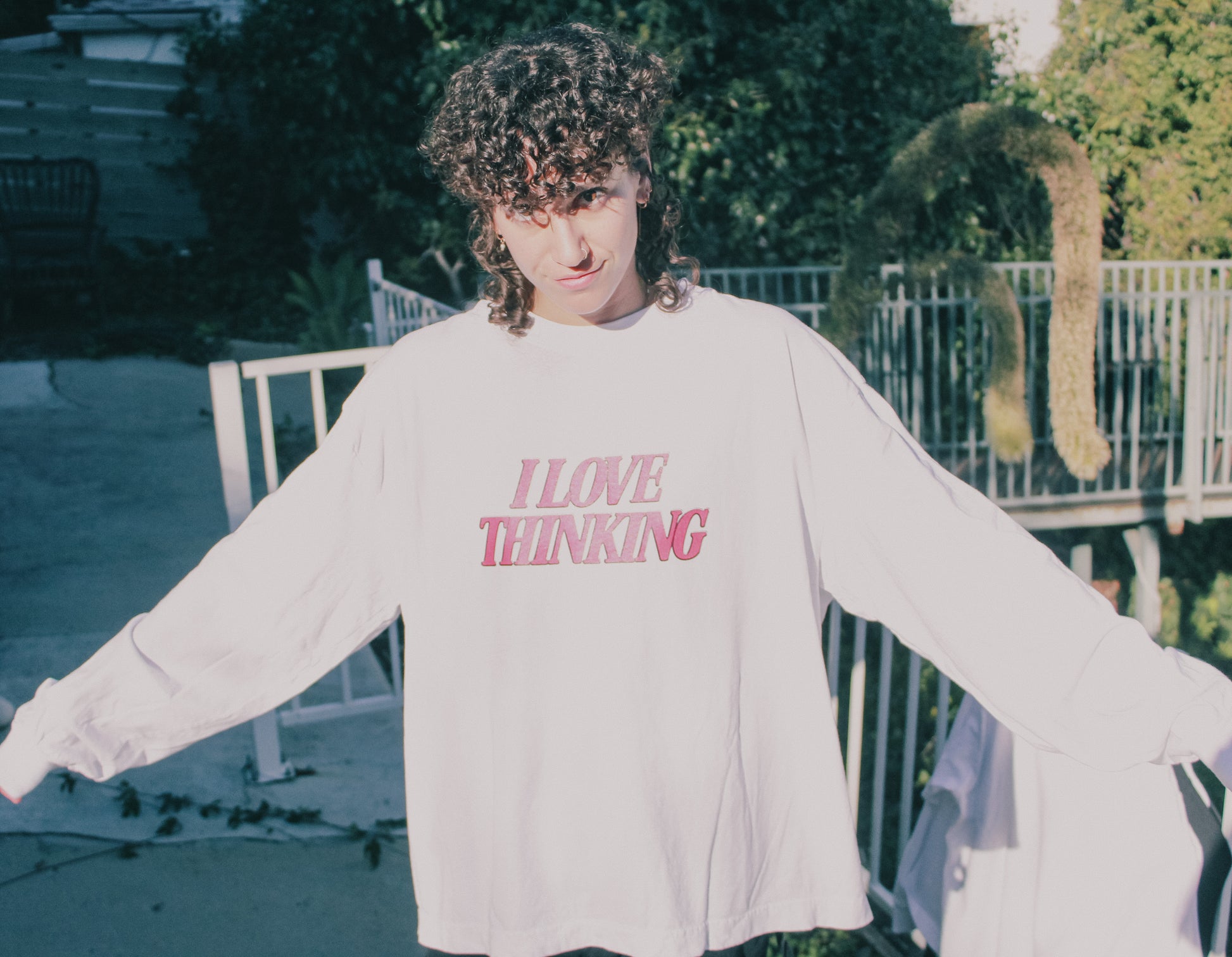 Long sleeve crew neck T-shirt with a relaxed fit. I LOVE THINKING printed in red with black outline on the front. Bridget is 5' 4" and wearing a size medium.