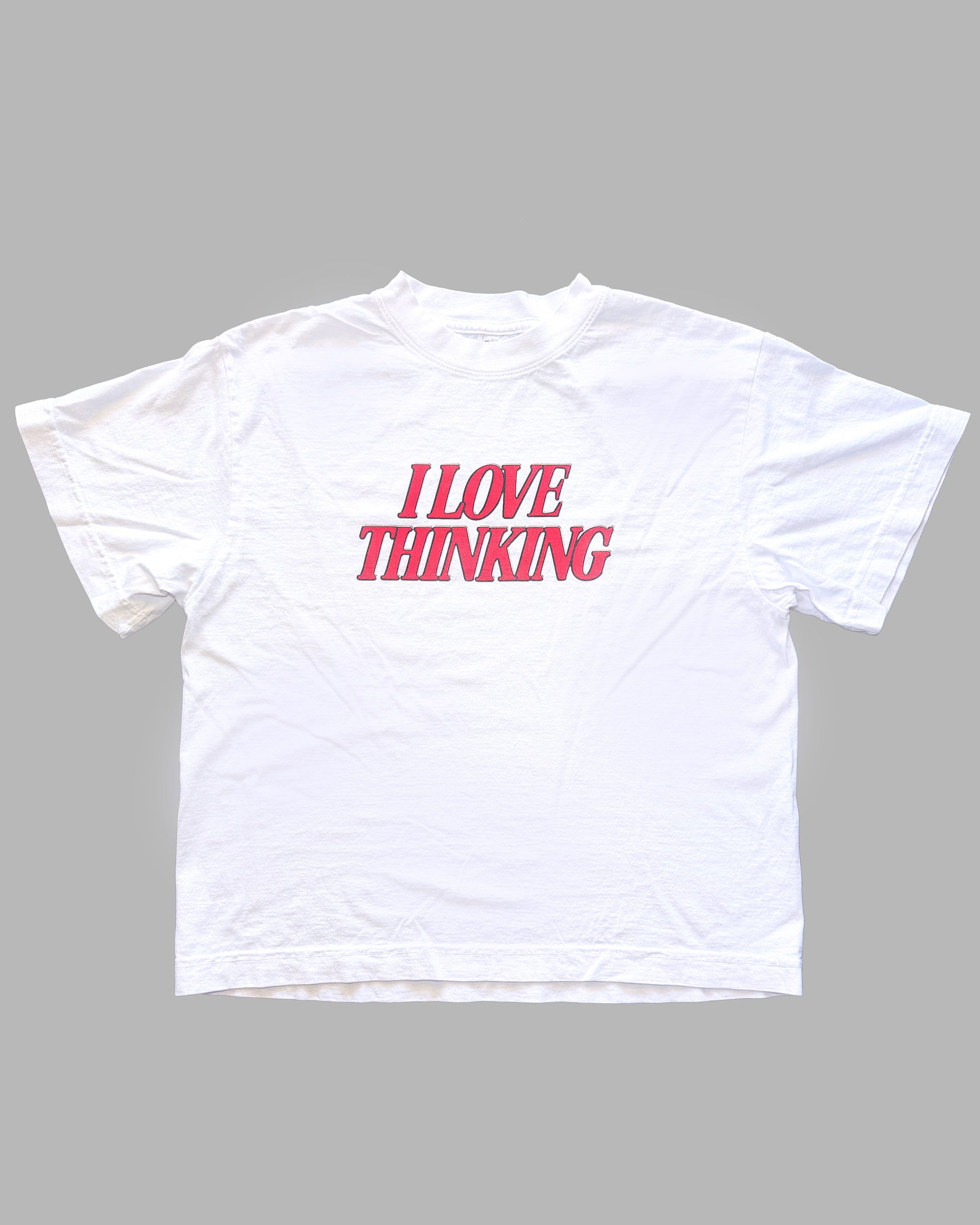 Tubular body with a slightly boxy oversized fit. Midweight cotton. I Love Thinking in red with black outline printed on the front. Bridget is 5' 4" and wearing a size small.