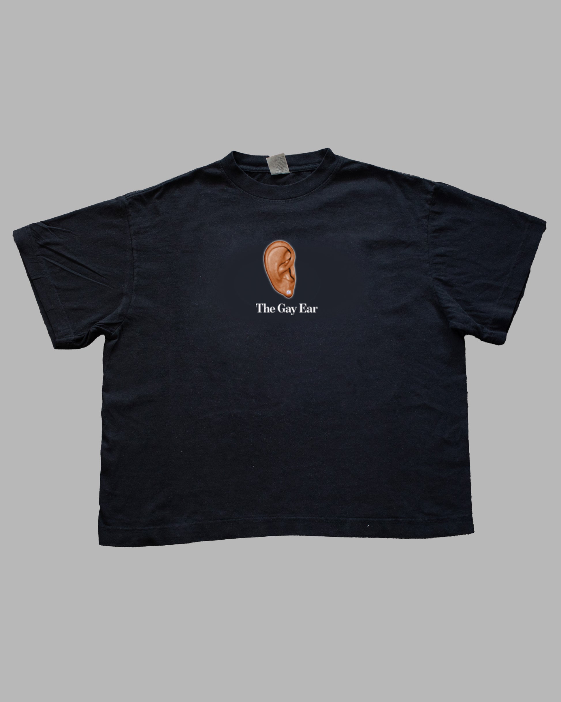 Tubular body with a slightly boxy oversized fit. Midweight cotton. Image of a right ear with an earring with The Gay Ear printed in white underneath. Bridget is 5' 4" and is wearing a size medium.